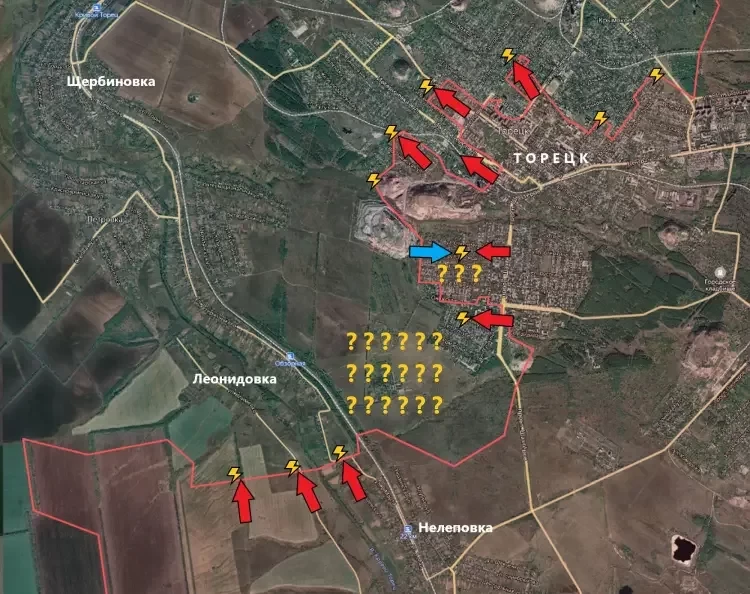 На Торецком направлении подразделения ВС РФ продвинулись по направлению к Леонидовке. Ранее наши бойцы уже присутствовали на этих позициях, но вынуждены были отступить. В центральной части Торецка штурмовые отряды ВС РФ продвигаются вперёд. Сейчас наши бойцы находятся на подступах к одному из терриконов в центральной части города.