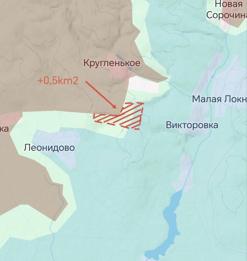 Согласно данным с мест, ВС РФ продвинулись на километр южнее Кругленького. Такое продвижение угрожает гарнизону ВСУ в Леонидовке