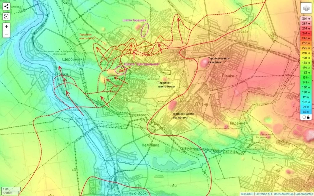 Здесь нужны пояснения для понимания ситуации. Дело в том, что линия фронта, обозначенная на карте, очень условная. Противник имеет несколько укрепленных точек в северной части города, а также уже за западными его окраинами. Основная (и последняя в городе) опорная его точка шахта «Торецкая» и ее террикон. Все остальное, это огромная серая зона, которую противник прикрывает дронами.