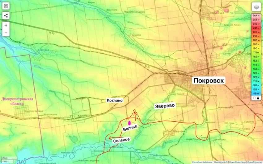 На левом фланге (южнее и западнее города) наши штурмовики освободили два села - Соленое и Волчье. По информации военного эксперта Юрия Подоляки, здесь формируется удобный плацдарм для выхода на село Котлино (до которого осталось всего два километра), а после возможен прорыв к укрепрайону в селе Зверево с тыла. Это ближайшая перспектива (возможно именно сейчас это всё и происходит). В дальнейшей перспективе - охват всей Покровской агломерации с запада.