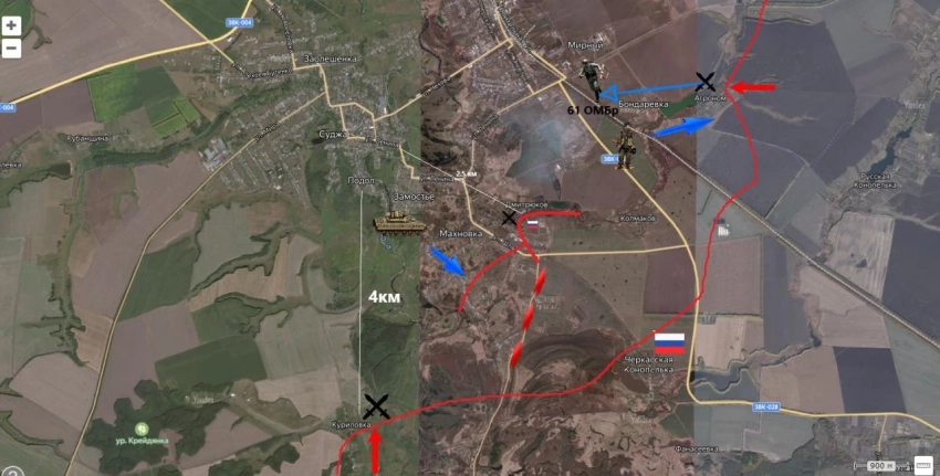 На территории Суджанского района идут зачистки лесополос восточнее Махновки. Севернее Мартыновки войска РФ продолжают наступление вдоль трассы Р-200. В районе Новоивановки отмечено продвижение к Леонидово и Александрии.