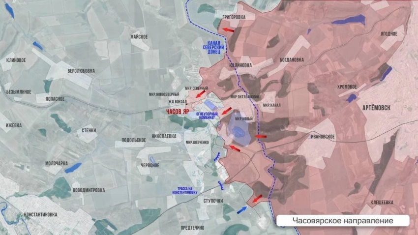 Часвоярский участок тоже радует новостями. Украинские околовоенные паблики признают потерю территории завода огнеупоров и мкр. Северный. С нашей стороны уточняют, что часть мкр. еще не зачищена, но главный укрепрайон - ж/д вокзал, - под нашим контролем. Основные бои идут за квартал многоэтажек к западу от завода, часть зданий уже под контролем ВС РФ. Активизировался и южный фланг, передовые отряды заходят с южных окраин города и довольно активно продвигаются.