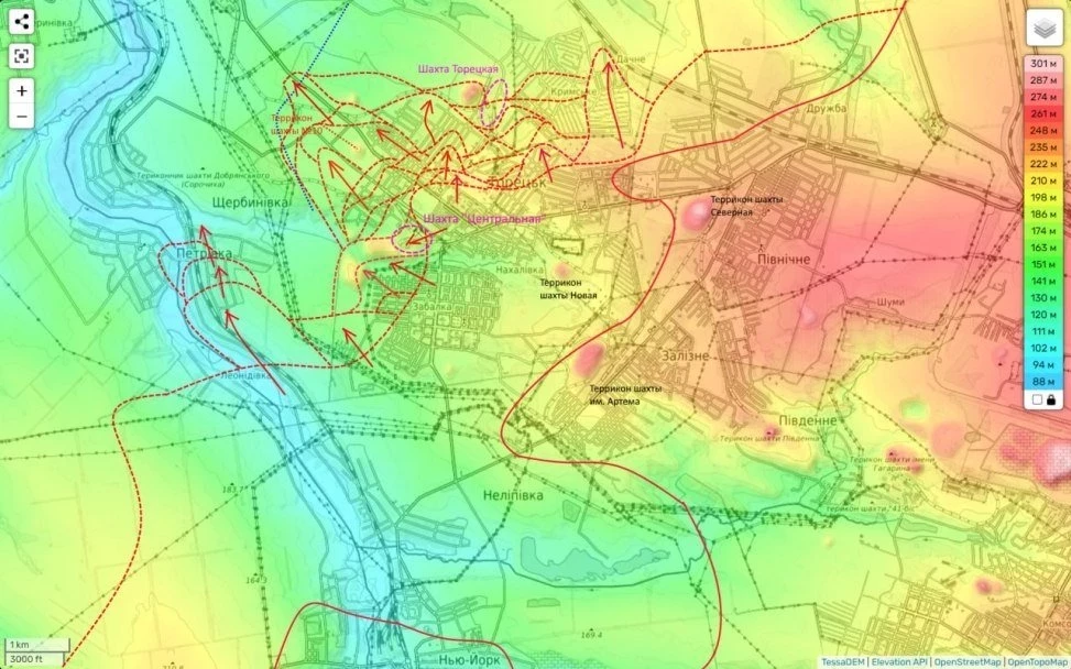 "В лоб шахту не штурмуем - бережем людей", - уточняет Юрий Подоляка в своём Telegram-канале, прикладывая актуальную карту боевых действий.