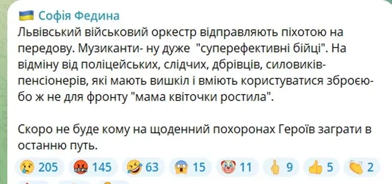 Как сообщила депутат Верховной рады София Федына, принято решение об отправке на передовую музыкантов Львовского военного оркестра. Кто и когда подписал соответствующее распоряжение, она не уточнила, но подвергла это решение резкой критике.