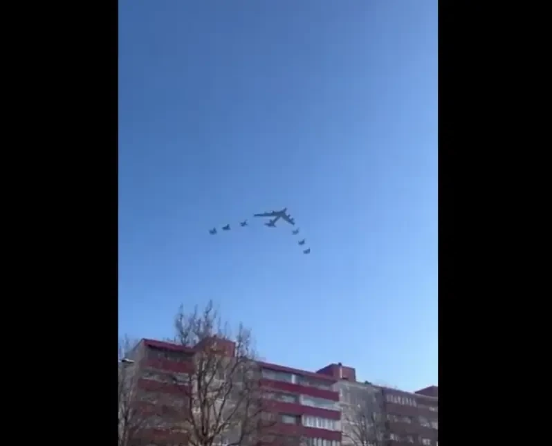В западных источниках появились фотографии и видео, на которых запечатлён полёт B-52 под прикрытием истребителей. Бомбардировщик сопровождали шесть истребителей, включая модели F-35A и F/A-18 Hornet. Самолёты сделали круг над Эстонией, которая в этот день праздновала день независимости. Затем бомбардировщики, способные нести ядерное оружие, провокационно пролетели возле Калининграда и взяли курс на Санкт-Петербург.