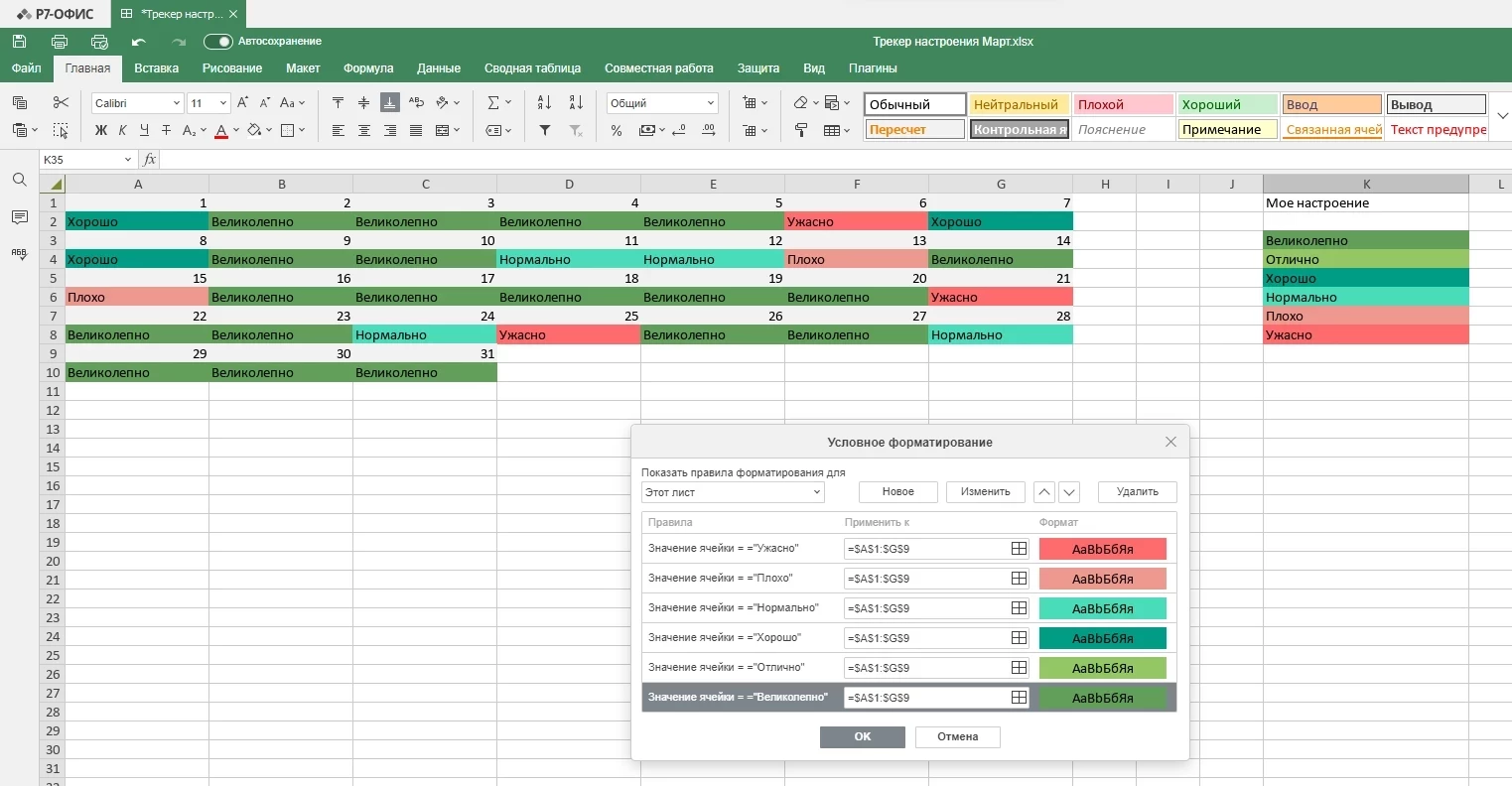 В отдельной колонке создайте шкалу настроений. Например, используйте шесть уровней от «Великолепно» до «Ужасно», каждому присвойте свой цвет.