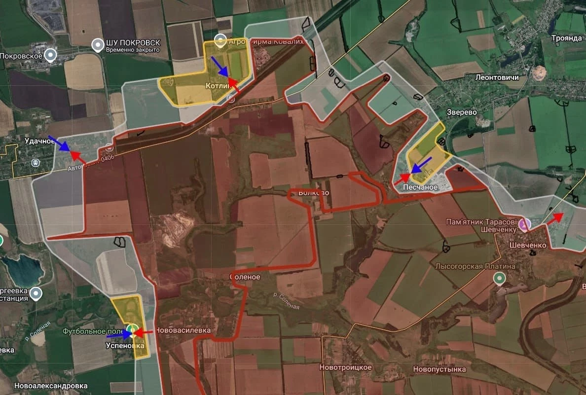 На Покровском направлении отмечаются локальные боестолкновения в районе Зелёное Поле, Барановка, Песчаное, Котлино, Удачное и Успеновка, сообщает Telegram-канал "БелВПО".