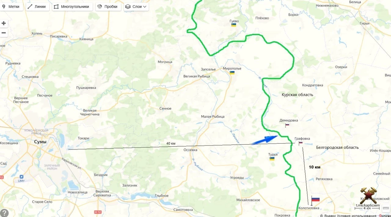 Между тем, сегодня во вторник на стыке Курской и Белгородской областей была осуществлена атака ВСУ манёвренной группой. Графовка находится в 10 км от МАПП Колотиловка, от которой самый удобный и короткий путь на украинский областной центр город Сумы - около 40 км. А накаты ВСУ на Колотиловку в том году проходили регулярно и с танками и с РСЗО.