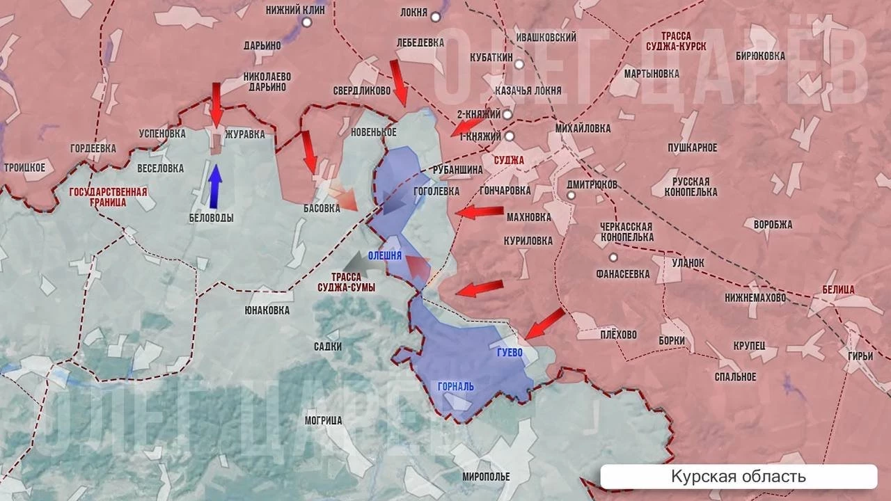 В Курской области продолжаются ожесточённые бои в лесополосах западнее Гоголевки, также наши продвигаются в окрестностях Гуево, информирует в своём Telegram-канале Олег Царёв.