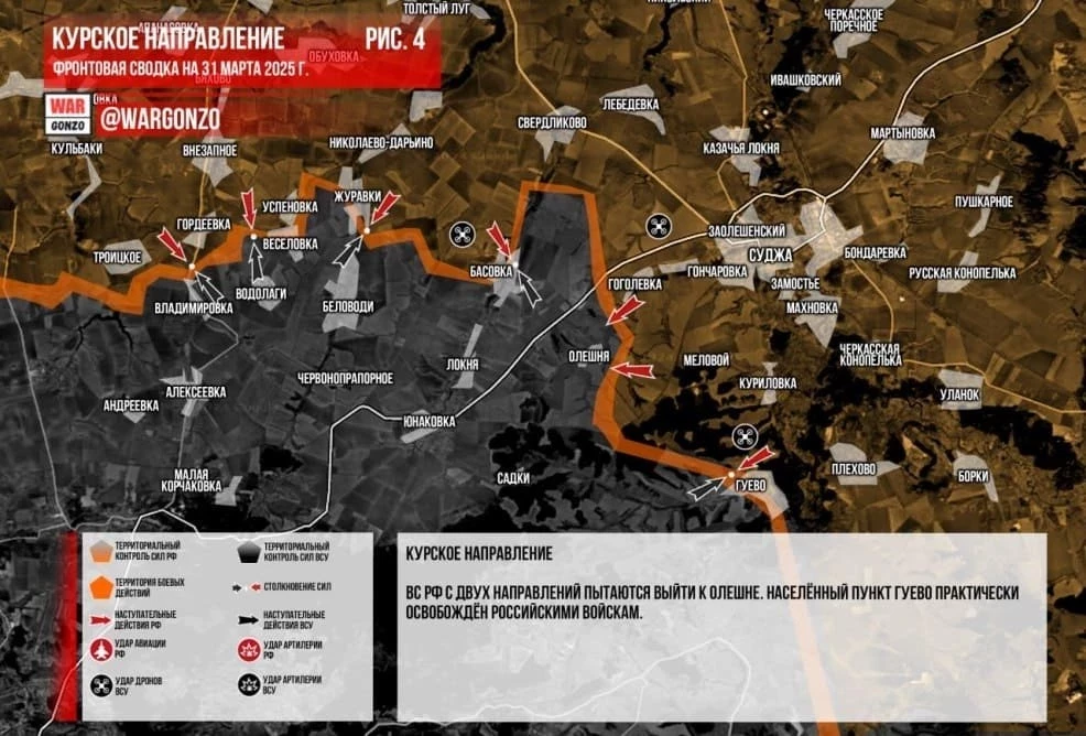 ВС РФ ведут ожесточённые бои в районе Гуево в Курской области: карта боевых действий по состоянию на 31 марта 2025 года