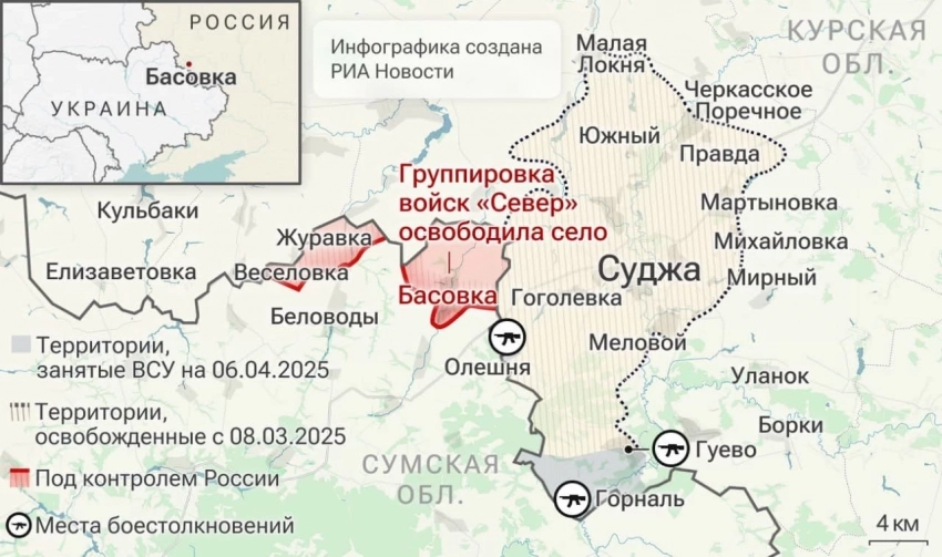 В Курской области идут ожесточённые бои в Гуево и Олешне: карта боевых действий на 07.04.2025