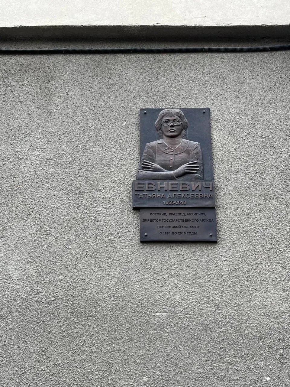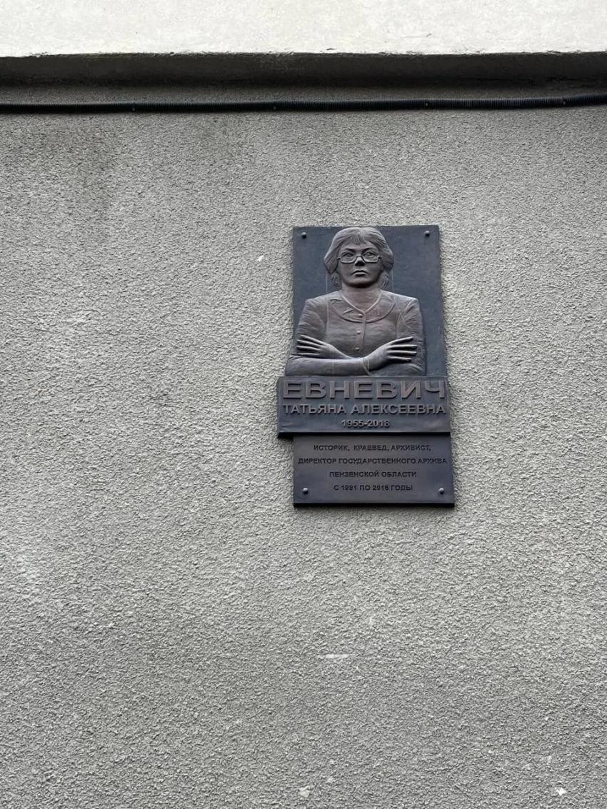 На стене здания нас встречает мемориальная доска Татьяне Алексеевне Евневич , историку, краеведу, архивисту и директору Государственного архива Пензенской области с 1991 по 2016 год