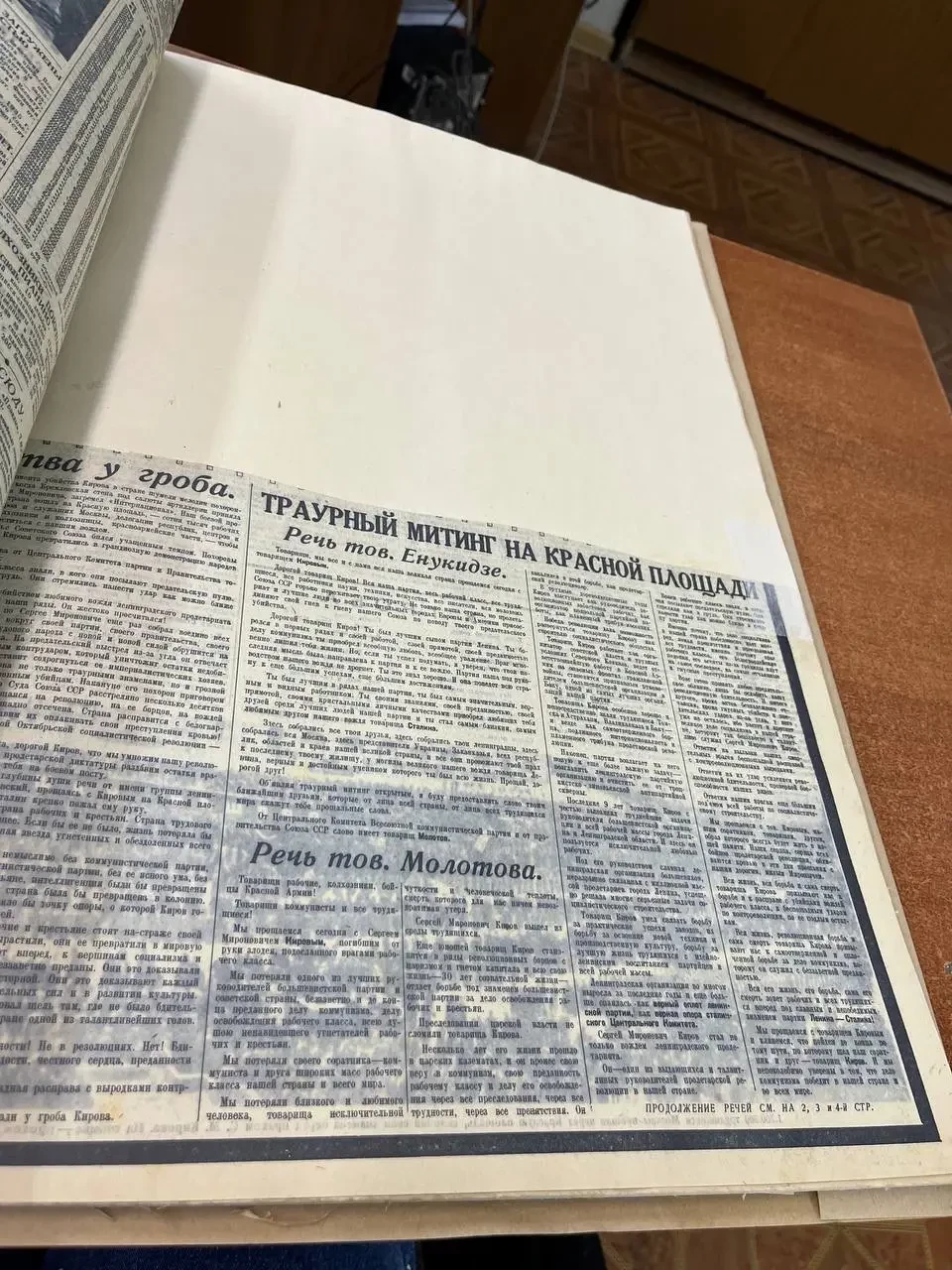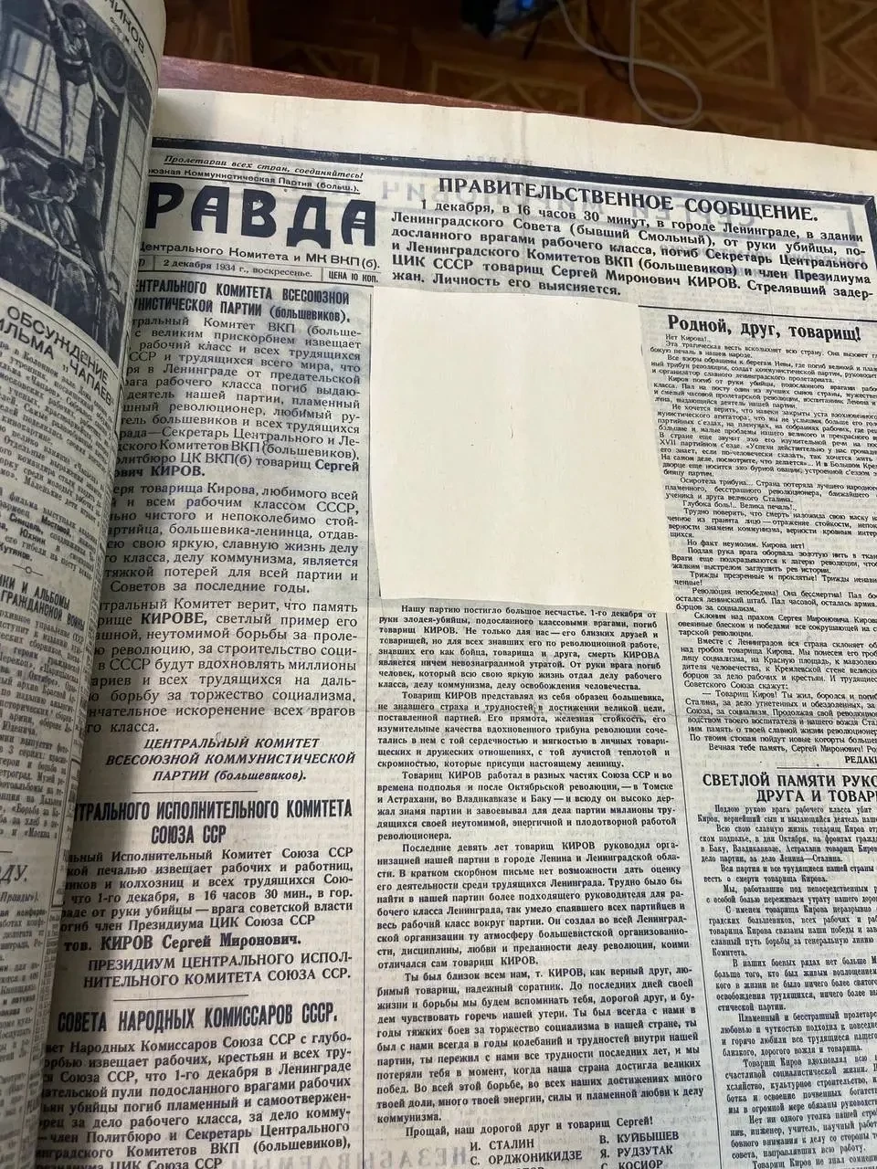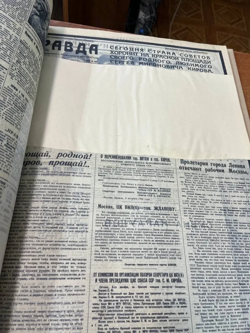 Газета «Правда» с сообщением об убийстве Кирова. Видимо, в центре был его портрет, но, скорее всего, кто-то его вырезал, и пришлось работникам архива пустой прямоугольник заклеить!