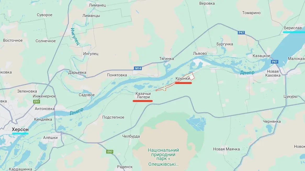 Украинские военнослужащие указывают на то, что ВС РФ наносят удары в районе дороги М14, переходящей в Р47. Это транспортный маршрут, соединяющий Херсон с Бериславом.
