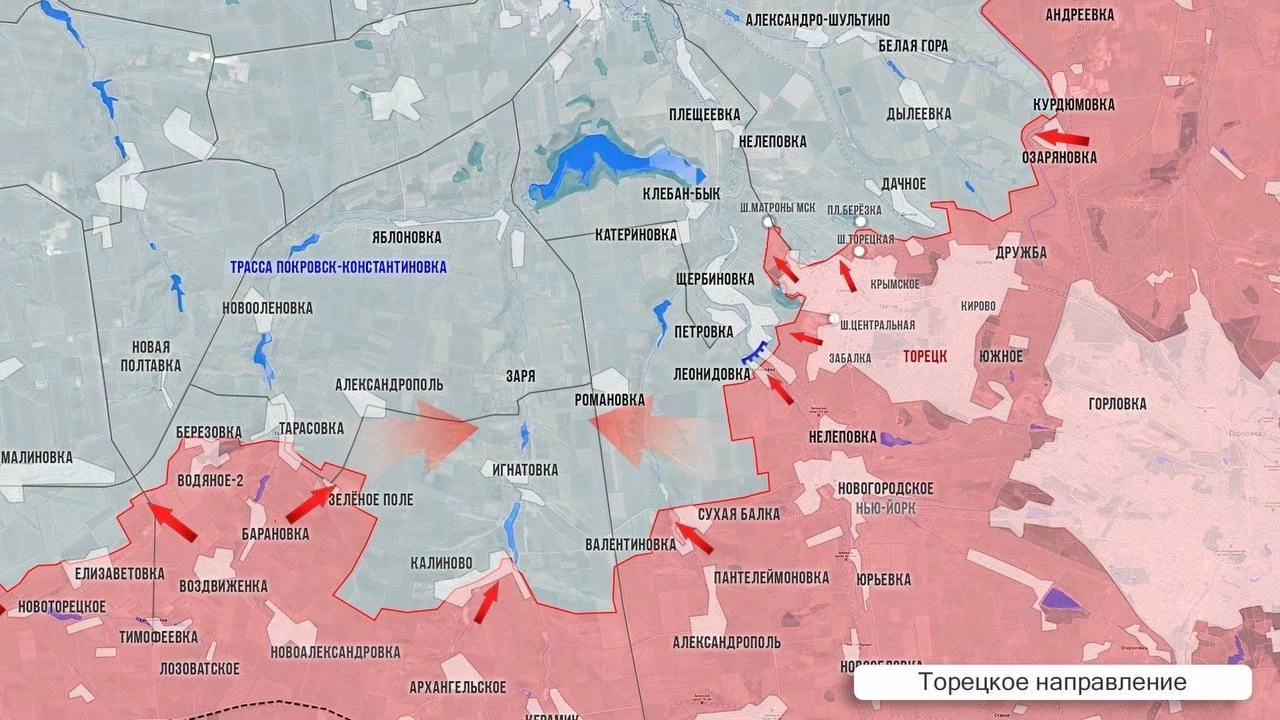 Западнее Торецка ВС РФ разворачивают наступление к северу от Тарасовки. Штурмовики пробиваются в сторону Новой Полтавки, вдоль правого берега реки Бычок движутся к Новоленовке, а также возобновили движение к Александрополю. Немного ниже по карте ВС РФ начали выравнивать фланг, двигаясь со стороны Новоалександровки к Калиново и Старой Николаевке. Севернее Сухой Балки наши войска пробиваются в сторону Романовки. К северу от Торецка ВС РФ продолжают атаки в районе Дылеевки, сообщает Олег Царёв в своём Telegram-канале.