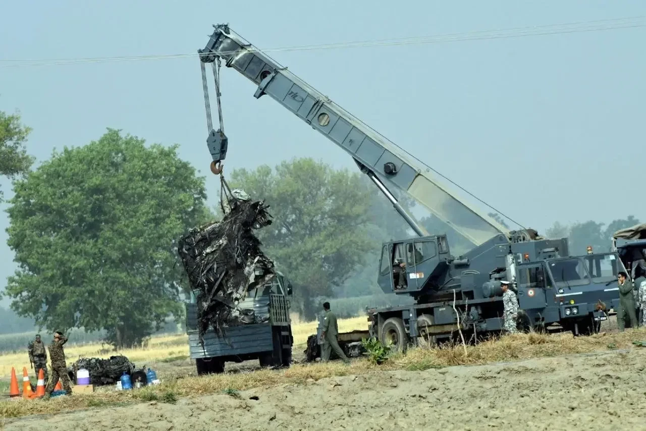 Местные ресурсы распространили фото, на котором запечатлена эвакуация обломков упавшего у селения Акила у Гонианы в округе Батинда в индийском штате Пенджаб Dassault Rafale EH.