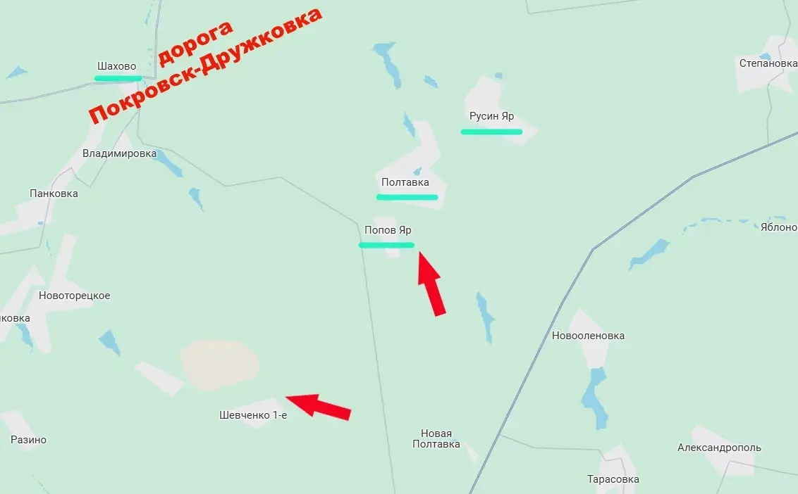 Противник вынужден держаться за линию Попов Яр – Полтавка- Русин Яр, к которой подошли наши, чтобы не допустить выхода ВС РФ к упомянутой автодороге, ведь в противном случае армия России возьмёт её под физический контроль, что в значительной степени нарушит логистику ВСУ между Покровском и Славянско-Краматорской агломерацией. Сейчас до указанной автодороги около 8 км.