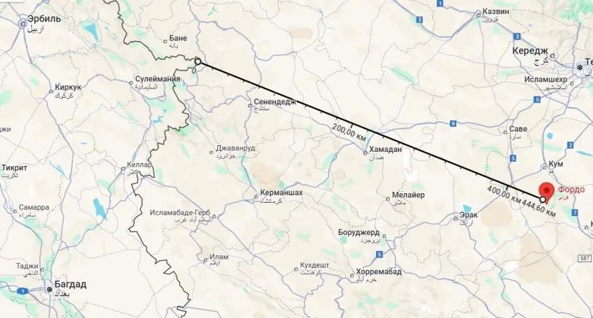 Для сухопутной локальной операции могут быть использованы возможности по высадке десанта с моря, а также переброска нескольких диверсионных групп через сухопутную границу Ирана. В качестве второго варианта рассматривается сценарий с использованием Иракского Курдистана. Во-первых, курды относительно лояльны по отношению к Израилю, во-вторых, до объекта в Фордо кратчайшее расстояние от сухопутной границы иностранного государства - именно от Ирака. Минимальное - около 410 км. От границы Иракского Курдистана – около 440 км. Но это всё по прямой. А по прямой в Иране, мягко говоря, непросто.