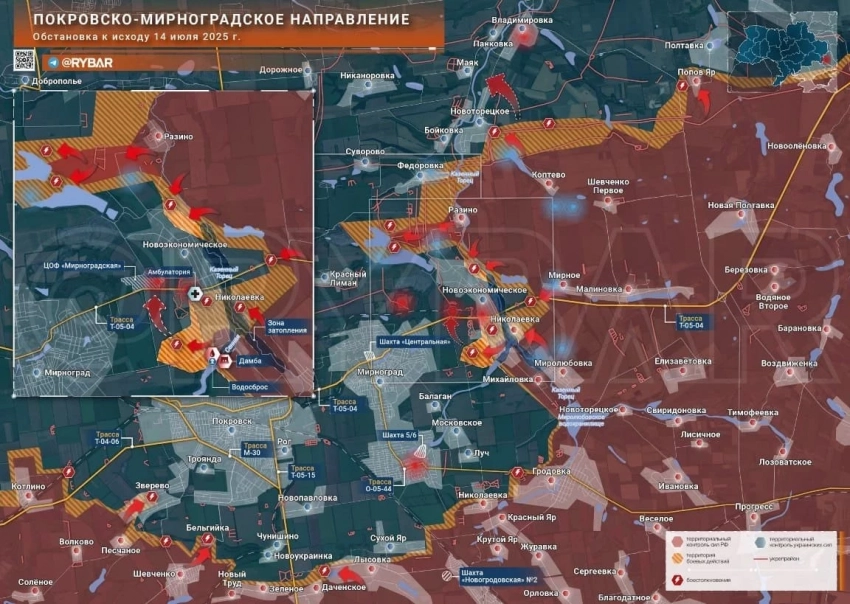 На Покровском фронте гремит восточный участок. Освободив в начале месяца Разино, армия России стремительно продвигается на запад, наши на 4 км приблизились к Красному Лиману и подошли к шламоотстойникам у шахты возле Родинского. Кроме этого, штурмуют Новоэкономическое с севера, выбивают ВСУ из Фёдоровки, Бойковки и в районе Новоторецкого. Севернее этого района по данным МО освобождён Маяк. Контроль над посёлком позволяет обезопасить фланги и тылы российских частей, наступающих на Покровско-Мирноградскую агломерацию с востока. У гарнизона ВСУ в этих городах остались только две логистические артерии. Первая идёт в Днепропетровскую область через Котлино и Удачное, однако оба села находятся под огневым контролем нашей армии, а кроме этого, в конце июня было освобождено Волково в 2 км южнее. Вторая трасса связывает Покровск с Павлоградом, за неё идут ожесточенные сражения: командование ВСУ перебрасывает на этот участок подкрепления, поскольку без этой дороги гарнизон ВСУ в Покровске и Мирнограде долго не протянет.
