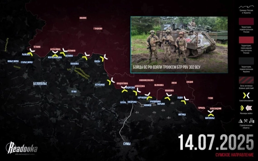 В Сумском приграничье ВС РФ со стороны Теткино зашли накануне в Рыжевку и ведут бои за село. Южнее есть тактические успехи в Юнаковке и на северной окраине Мирополья.