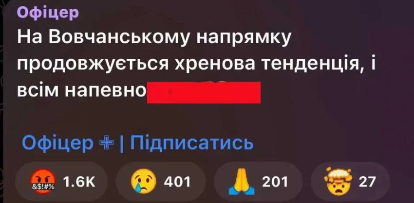 Значительное осложнение ситуации на Волчанском направлении подтверждает и сам противник. В малолитературных формулировках в мессенджерах украинские «волонтёры» и военные пишут о том, как ситуация для ВСУ обострилась в Волчанске, а также к востоку и к западу от него.