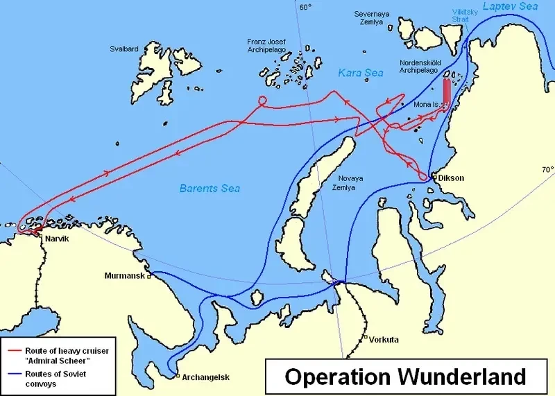 На следующий день разведывательные самолеты Люфтваффе обнаружили между Шпицбергеном и островом Медвежий две группы союзных боевых кораблей. Это были американские тяжелый крейсер “Tuscaloosa” и эсминцы “Rodman” и “Emmons”, а также британские эсминцы “Martin”, “Marne”, “Onslaught”, следовавшие из Мурманска на запад. Исходя из этого, немцы предположили, что эти корабли могли столкнуться с «Ульмом».