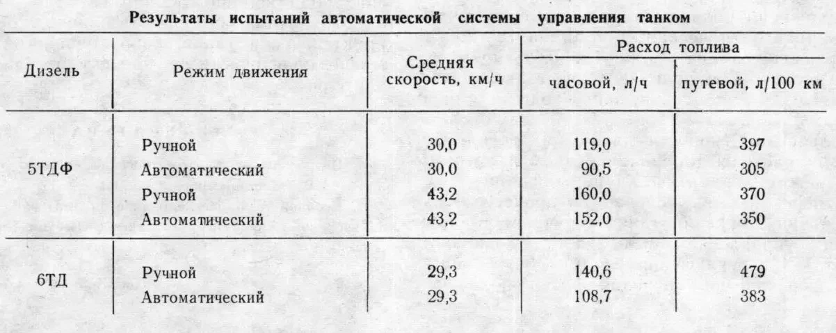 Меньшая, но всё же заметная разница в расходе топлива была выяснена и при «покатушках» на средних скоростях более 40 километров в час — там, где различия между автоматическим и ручным переключением передач, казалось бы, должны стираться. Например, у движка харьковской «шестьдесятчетвёрки» 5ТДФ часовой расход топлива снизился на 8 литров, а путевой на 100 километров — на 20 литров.