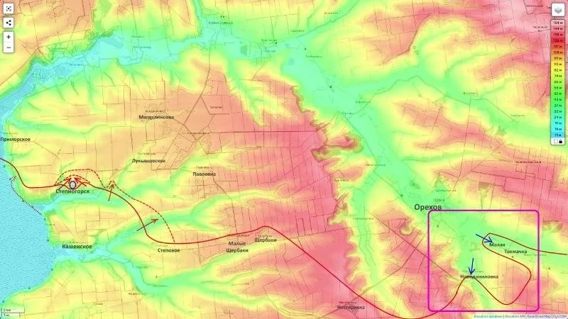 По его словам, тактические успехи здесь наблюдаются не только в самом городе, но и вокруг него. Причём, российские войска «заворачивают» свой левый фланг на северо-восток, заходя в тыл ореховской группировки ВСУ.