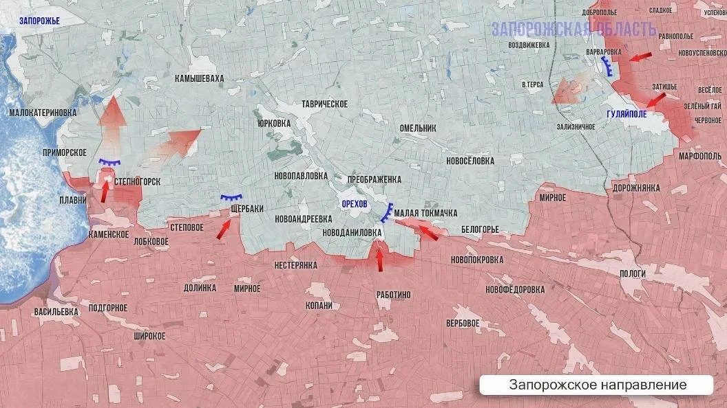 На Запорожском фронте продолжаются бои в Приморском и Степногорске. В Степногорске ВС РФ теснят ВСУ и расширяют зону контроля. В районе Орехова позиционные бои у Новоданиловки и Малой Токмачки. ВСУ атаковали дронами жилой сектор в районе Каменки-Днепровской, минимум один человек ранен.