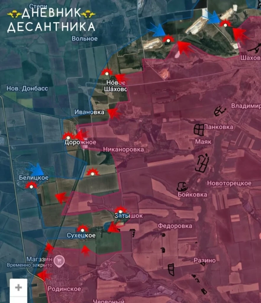 На западной части выступа идёт зачистка Родинского и бои за Белицкое. В Суворово (Затышок) бои сместились к центру, наши войска взяли под контроль восточную часть села и территории южнее, включая два крупный укрепленных опорных пункта.