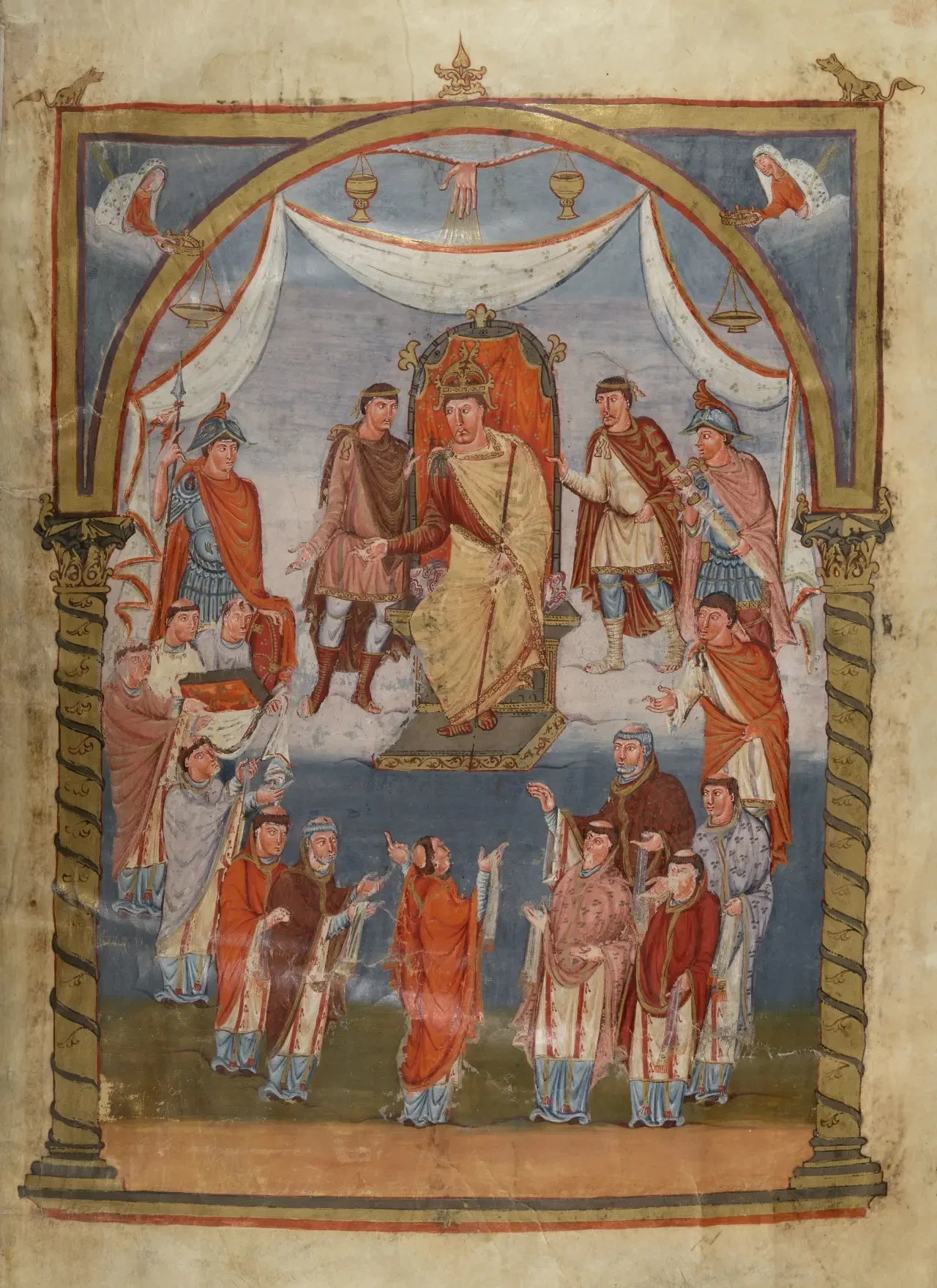 «Братия турского аббатства св. Мартина преподносит Библию королю Карлу». Миниатюра на листе 423. Слева и справа от короля, сидящего на троне стоят воины в гребневых шлемах с полями. «Первая Библия Карла Лысого» или «Библия Вивиана». Национальная библиотека Франции, Париж