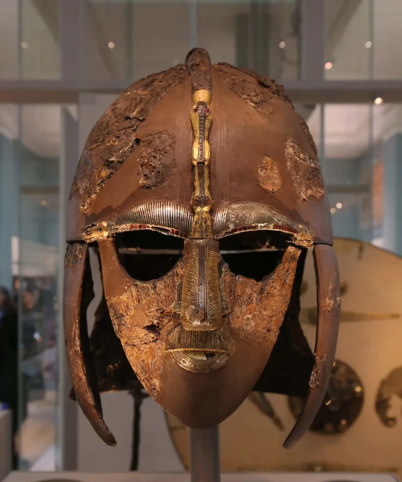 Но самый типичный «вендельский шлем» нашли не в Скандинавии, а в Англии, в местечке Саттон-Ху – курганном некрополе восточнее Вудбриджа в английском графстве Саффолк. Там в 1938 – 1939 гг. были сделаны, возможно, самые значительные археологические открытия в истории Англии, поскольку там был обнаружен нетронутый погребальный корабль, принадлежавший королю англосаксов примерно VI – VII вв., в котором и обнаружили знаменитый «шлем из Саттон-Ху». Правда, археологам над ним пришлось потрудиться. Дело в том, что шлем из земли извлекли в виде множества мелких деталей, поэтому затем три года пришлось работать над его реконструкцией, а выставили его для обозрения только в 1945 г. А потом реконструировали еще раз, в 1970—1971 гг., так что свой теперешний вид этот шлем приобрел далеко не сразу!