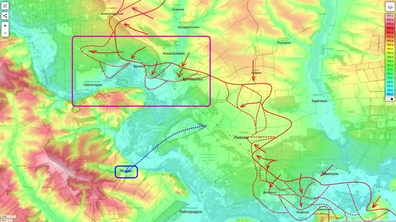 Российские передовые отряды выходят на подступы к Святогорску, продвигаясь западнее Яровой. Для начала полноценного штурма города необходимо окончательно дожать Яровую.