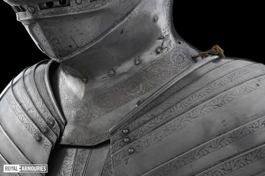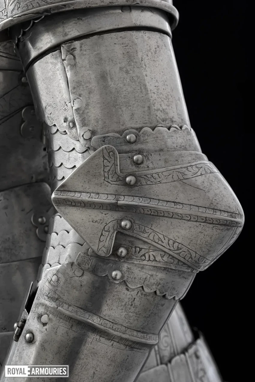 Наплечники из перекрывающих друг друга пластин стали отличительной особенностью мастерской в Гринвиче. Левый (если смотреть спереди) наплечник состоял из восьми полос, а вот правый почему-то из семи. Юбка состоит из девяти полос, как спереди, так и сзади. Петли на ней находятся слева, пряжки ремней справа. Латы для ног могли быть изготовлены в Италии или во Фландрии. Их попросту взяли от какого-то старого доспеха.