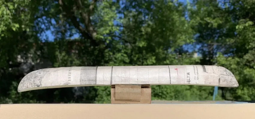 За «модель своего детства» я принялся еще летом и делал ее по хорошо отработанной технологии: сначала слепил корпус пироги из пластилина на основе картонного профиля корпуса и приклеенных к нему тоже картонных шпангоутов. Пластилин заполнял всё пространство между ними. Потом пластилин был оклеен тремя слоями газетной рваной бумаги. Первый слой только на воде, два последующих на клее ПВА. Свисавшая с краев бумага обрезалась ножницами.