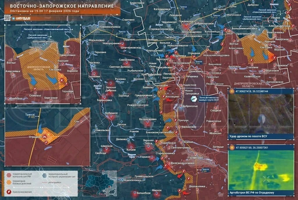 На Гуляйпольском направлении сохраняется высокая интенсивность боёв. Атаки фиксируются со стороны Гуляйполя в направлении Зализничного, а также в районах Воздвижевки, Рождественского и Терноватого. В треугольнике Цветковое - Криничное - Верхняя Терса сообщается о вытеснении украинских подразделений из ряда опорных пунктов. Продолжаются столкновения в районе Братского, Александровки и Покровского. Активные действия идут вдоль русла реки Янчур, где выявляются и уничтожаются мобильные группы противника. Со стороны Орестополя предпринимаются попытки продвижения к Берёзовому, бои отмечены у Сосновки. Западнее Ивановки российские подразделения заняли несколько позиций и ведут огонь по силам ВСУ в Гавриловке и Подгавриловке.