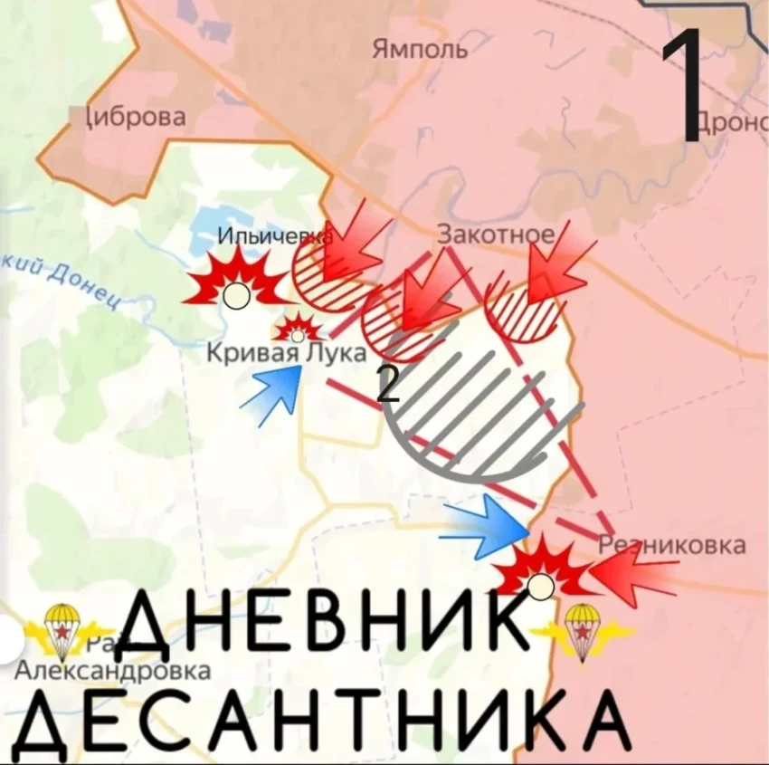 Южнее Ильичевки наши штурмовые группы улучшили позиции в "зеленке". Восточнее и северо-восточнее Кривой Луки удалось не только продвинуться, но и закрепиться на территории природного заповедника «Меловая флора», выйдя непосредственно к окраинам села.