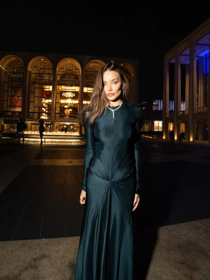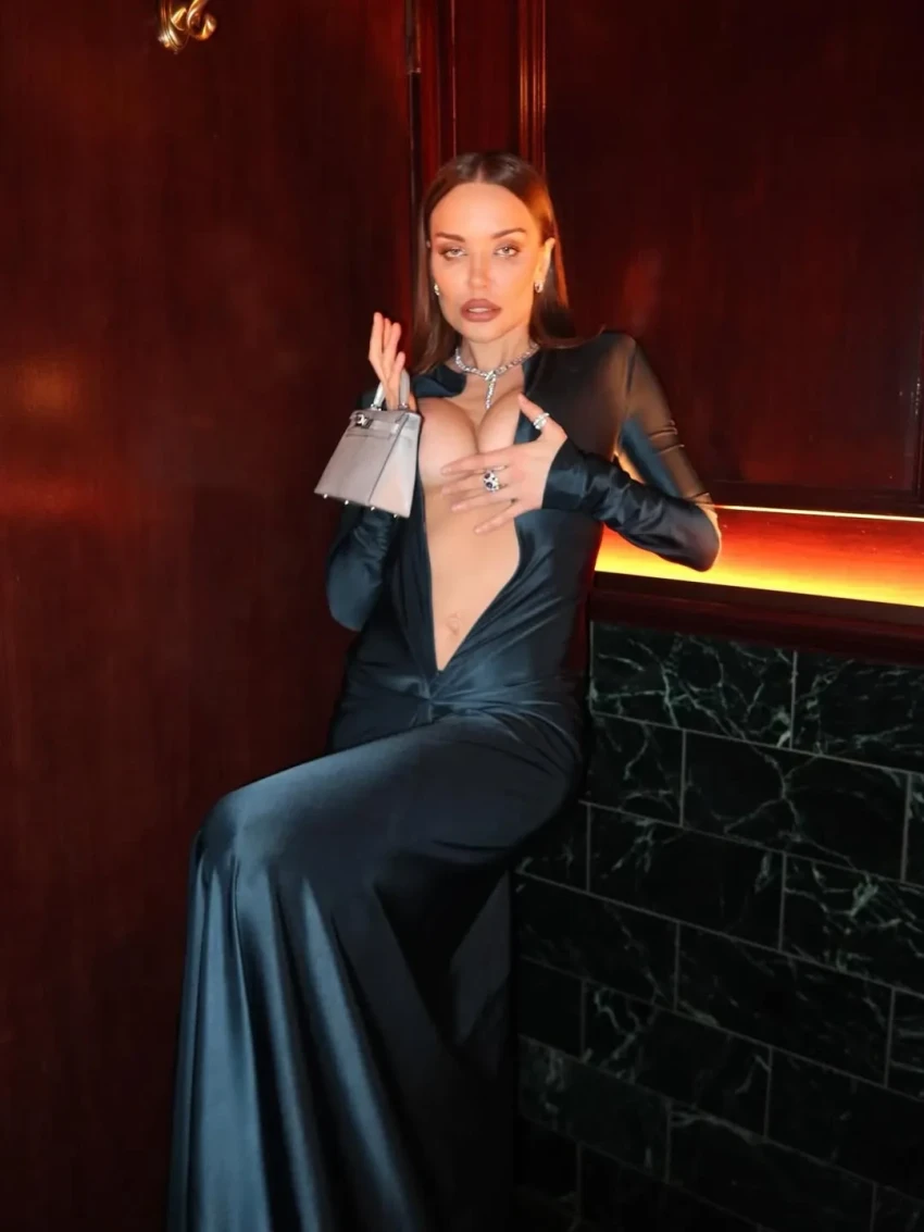 Коновалова опубликовала в соцсетях фотографии с праздника, на которых она позирует в длинном платье на молнии. Модель, которую ранее критиковали за неуместный внешний вид, расстегнула платье и фотографировалась в различных позах. Образ дополнили колье с бриллиантами и сумка Hermes.