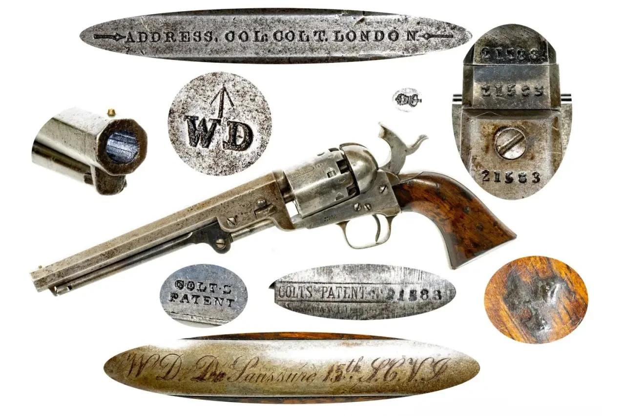 Кольт модели 1851 года стал первым настоящим коммерческим успехом не только в США, но и за рубежом. Например, он стал первым револьвером, официально принятым на вооружение британской армии. На фото револьвер британского офицера, участвовавшего в Крымской войне