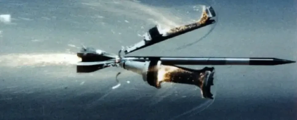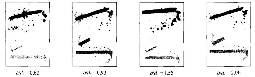 Пример осколкообразования ОБПС из тяжёлого сплава вольфрам-никель-железо с удлинением 15 (длина сердечника составляет 15 его диаметров) при взаимодействии с тонкими стальными преградами. b/dс — соотношение толщины преграды и диаметра корпуса активной части снаряда. Верхний ряд — рентгенограммы реальных корпусов, нижний ряд — результат моделирования. Источник: «Частные вопросы конечной баллистики»