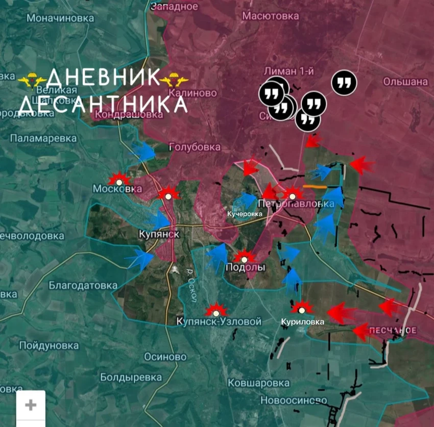 Со стороны Песчаного бойцы ВС РФ планомерно продвигаются к Купянску-Узловому с востока, разрезая вражескую группировку на секторы, но тут скорее пирог из позиций слоями плотнее получается.