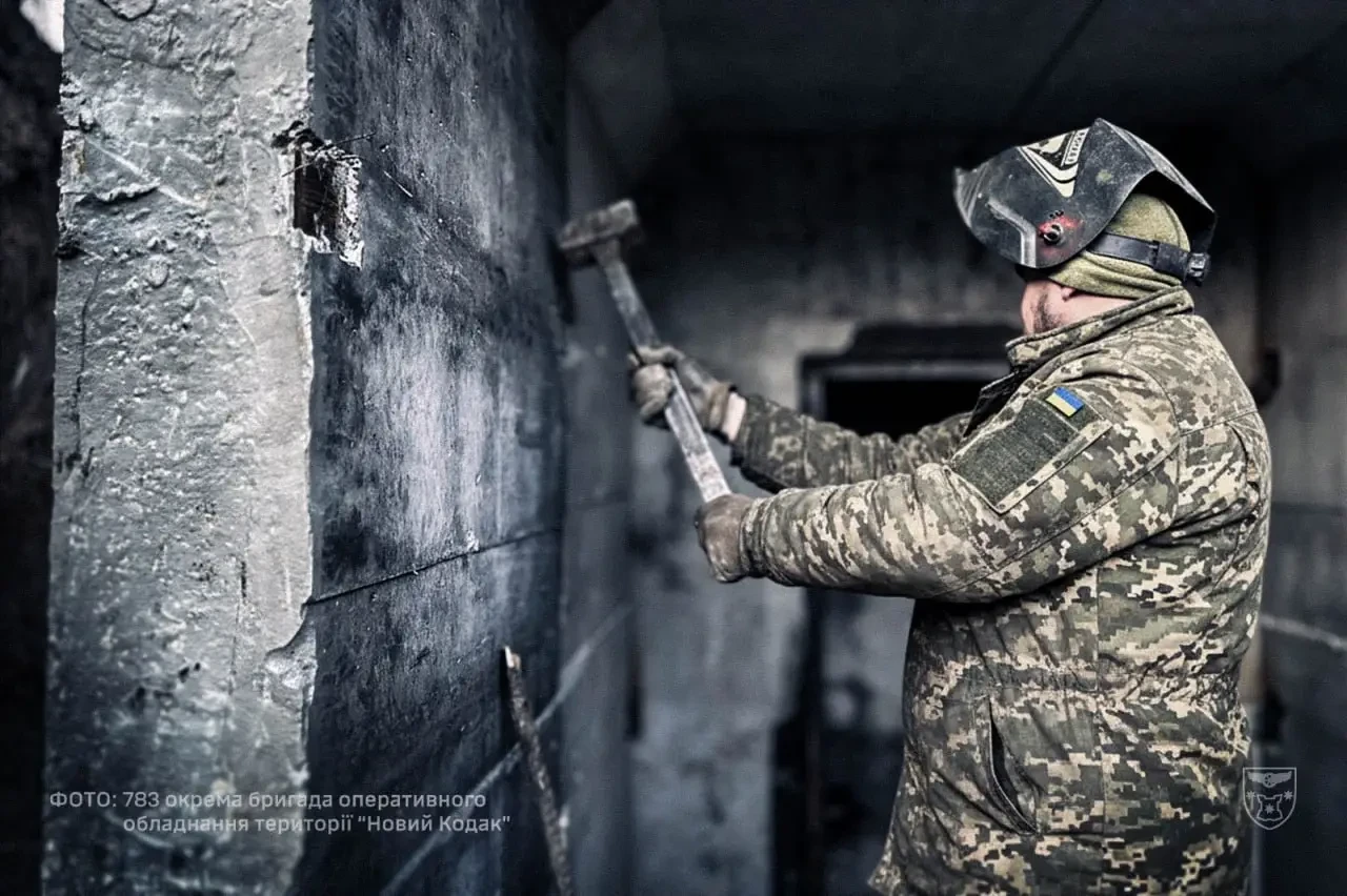 Следующий кадр подтверждает такое предположение, хотя дает повод для размышлений. На фото военнослужащий в сдвинутой на затылок маске сварщика бьет кувалдой по бетонной стене.