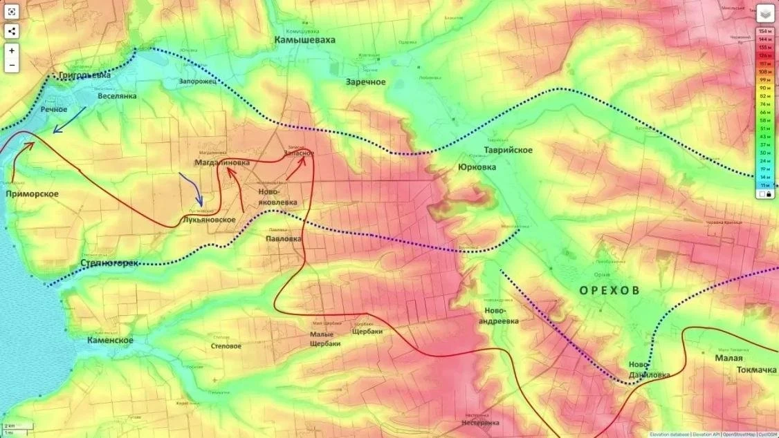 В свою очередь в полосе ответственности группировки войск «Днепр» российская армия прочно удерживает инициативу. В данный момент идут сложные позиционные бои с целью выдавливания противника из районов Магдалиновки и Запасного. Одновременно возобновлено наступление севернее Приморского, вдоль русла реки Конки.