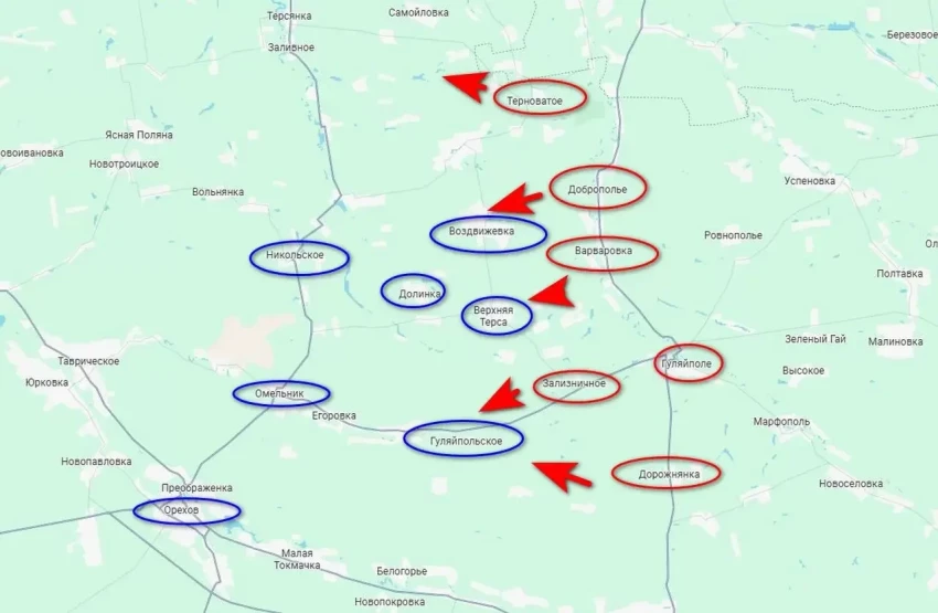 По последним данным, российские войска, сумев удержать позиции под ударами переброшенных украинских резервов, возобновили продвижение вперед. Особенно в районе Гуляйполя, где после взятия Зализничного штурмовые подразделения ВС РФ активно пошли на Гуляйпольское и дальше на Омельник, угрожая полностью отрезать весь Ореховский район обороны ВСУ.