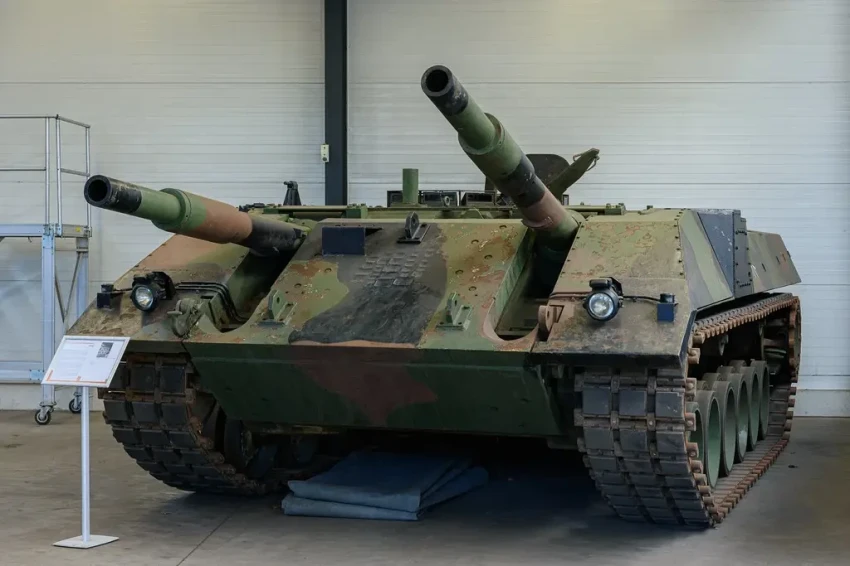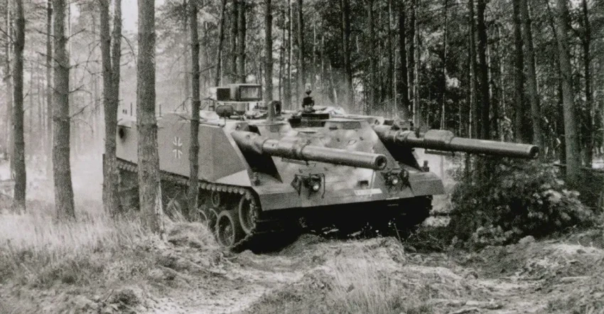 Решили сэкономить и вместо пушек поставили массогабаритные макеты. Массу снизили до 30 тонн. В ходе испытаний прототипов выявились новые ограничения. Например, машине сложно воевать в лесу и городской застройке – там, где классический танк просто повернет башню, казематному придется ворочаться всем телом. Научно это можно назвать зависимостью направления огня от направления положения корпуса танка. Собрали прототипы в 1975-76 годах и, после непродолжительных испытаний, оставили идею в покое. Игра с двумя пушками не стоила свеч. Решено было концентрироваться на разработке танка нового поколения, который более известен как Leopard 2.