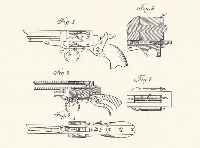 Патент Рута 1855 года на револьвер с канавками «зиг-заг» на барабане. Спусковой крючок в виде кольца имел штифт, входивший в одну из этих канавок. При движении назад спусковой крючок одновременно заставлял проворачиваться барабан!