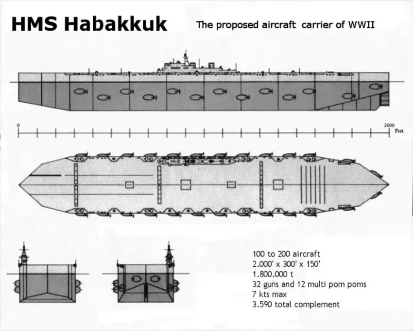 Окончательно остановились на проекте авианосца. Согласно предварительным расчётам, авианосец проекта «Хаббакук» должен быть около 610 м длиной, 90 м шириной и 60 м высотой с водоизмещением приблизительно 2,2 млн т. На его строительство потребовалось бы 3 млн м³ пайкерита, 25 000 т изоляционного материала, 35 000 т древесины и 10 000 т стали. Строительство корабля планировалось завершить зимой 1943/1944 годов, а его стоимость составила бы около 700 000 фунтов стерлингов.