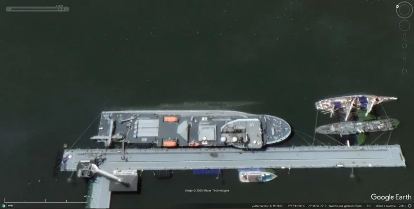 Cпутниковый cнимoк Googlе Еаrth: плавучая испытательная платформа INS Anvesh и учебные суда у пирса в городе Кочин. Снимок сделан в июне 2022 года