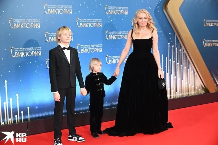 Яна Рудковская появилась на звездной дорожке в роскошном черном платье с волнующим декольте. Вместе с продюсерам к журналистам вышли ее младшие сыновья -Александр и Арсений.