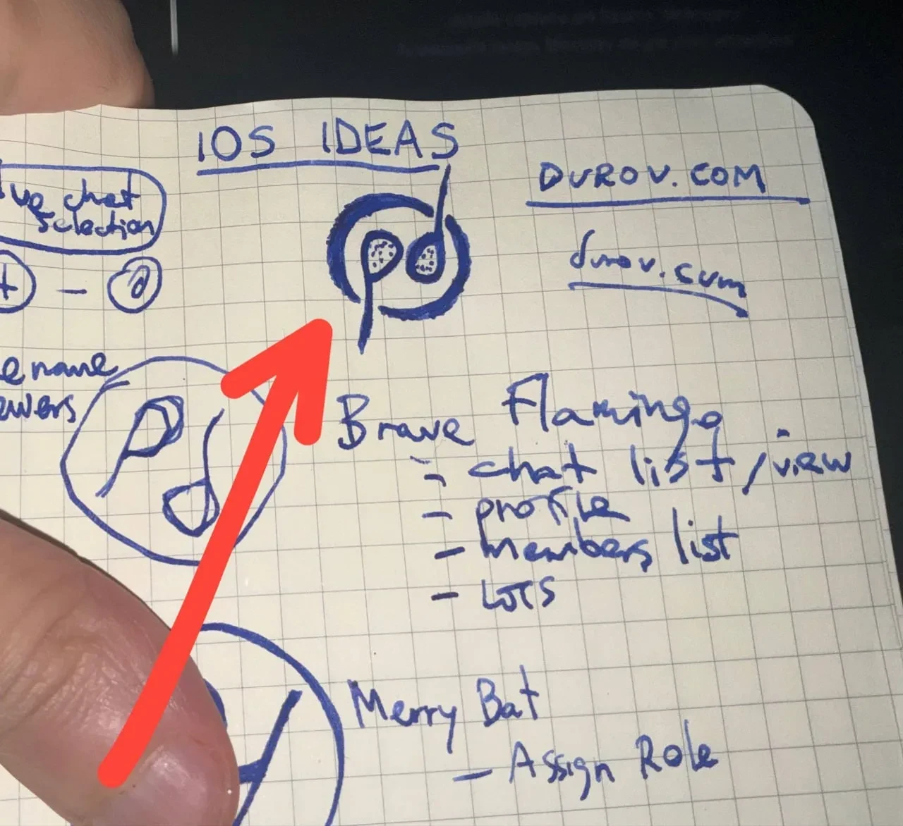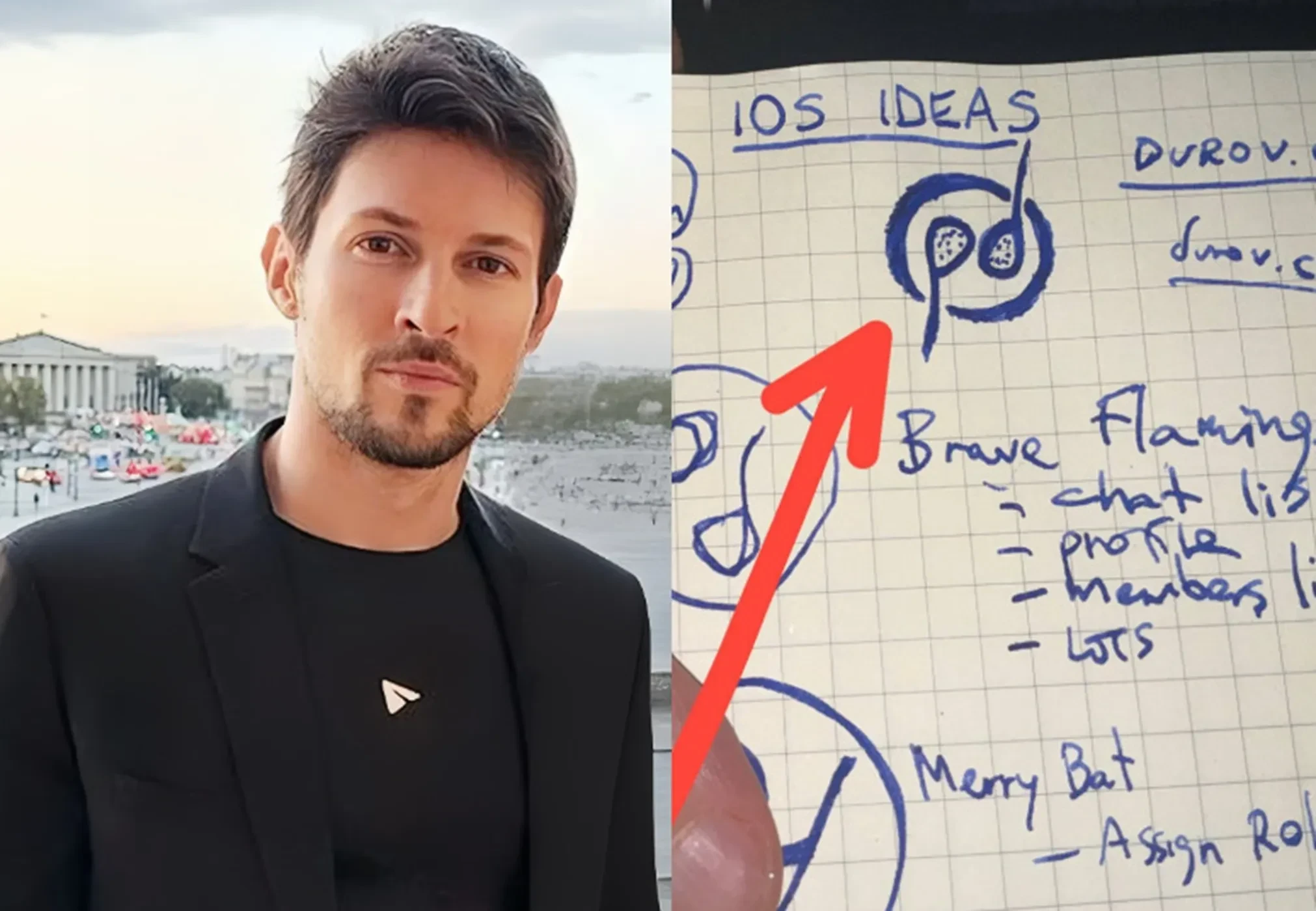 Фото из телеграм-канала Павла ДуроваДругии записи Дурова на листе, по всей видимости, являются его идеями для мобильного приложения, включая концепцию чата с профилями участников. Он также обыграл тему "программы" в адресе сайта "durov.cum", где название домена "cum" переводится как "сперма".